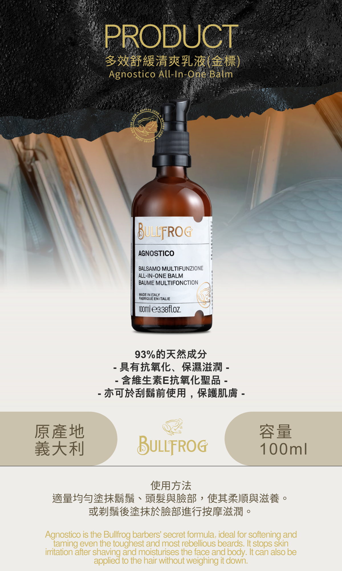 一款多用途產品。專門來訓服那些堅硬且頑固的鬍鬚。塗抹於鬍鬚與頭髮使其順澤且不壓垮頭髮,或是用於臉部進行保濕滋潤。亦可於刮鬍後塗抹臉部肌膚,防止肌膚刺激。