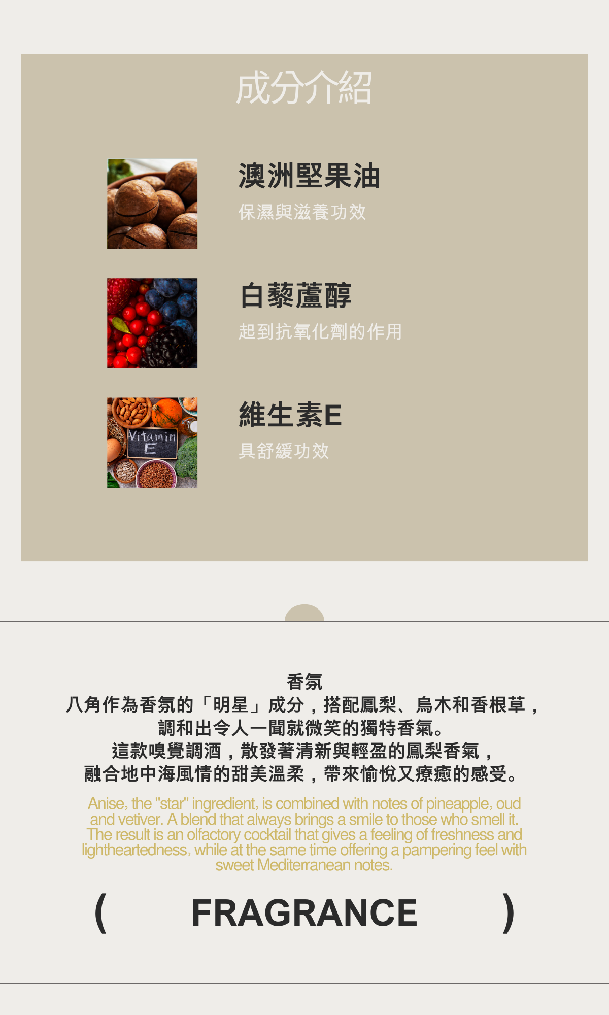AQUA (WATER), COCO-CAPRYLATE, CAPRYLIC/CAPRIC TRIGLYCERIDE, PANTHENOL, MACADAMIA TERNIFOLIA SEED OIL, PARFUM (FRAGRANCE), CETEARYL OLIVATE, TOCOPHERYL ACETATE, LAUROYL LYSINE, RESVERATROL, ALLANTOIN, CARNOSINE, PCA GLYCERYL OLEATE, CETEARYL ALCOHOL, SORBITAN OLIVATE, XANTHAN GUM, SODIUM PHYTATE, BENZYL ALCOHOL, DEHYDROACETIC ACID, LECITHIN, TOCOPHEROL, ASCORBYL PALMITATE, CITRIC ACID, SODIUM HYDROXIDE, TETRAMETHYL ACETYLOCTAHYDRONAPHTHALENES, TRIMETHYLCYCLOPENTENYL METHYLISOPENTENOL, TRIMETHYLBENZENEPROPANOL, ROSE KETONES, PELARGONIUM GRAVEOLENS FLOWER OIL, PINENE, LINALYL ACETATE, LINALOOL, LIMONENE, LAVANDULA OIL/EXTRACT, CITRUS AURANTIUM FLOWER OIL, CITRUS AURANTIUM PEEL OIL, CITRUS LIMON PEEL OIL, COUMARIN, CITRAL, CITRONELLOL, CARVONE, BETA-CARYOPHYLLENE, ANETHOLE, ACETYLCEDRENE.