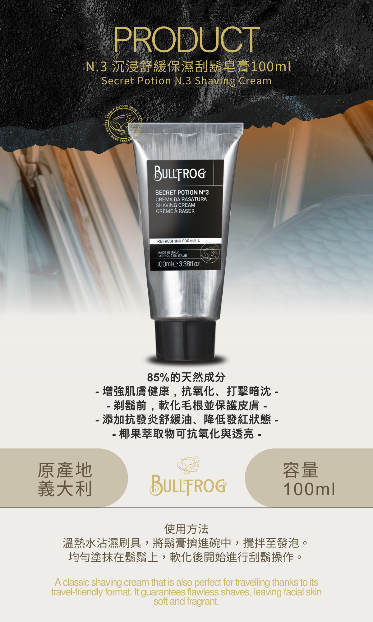 使用方法 : 溫熱水沾濕刷具,將鬍膏擠進碗中,攪拌至發泡。均勻塗抹在鬍鬚上,軟化後開始進行刮鬍操作。