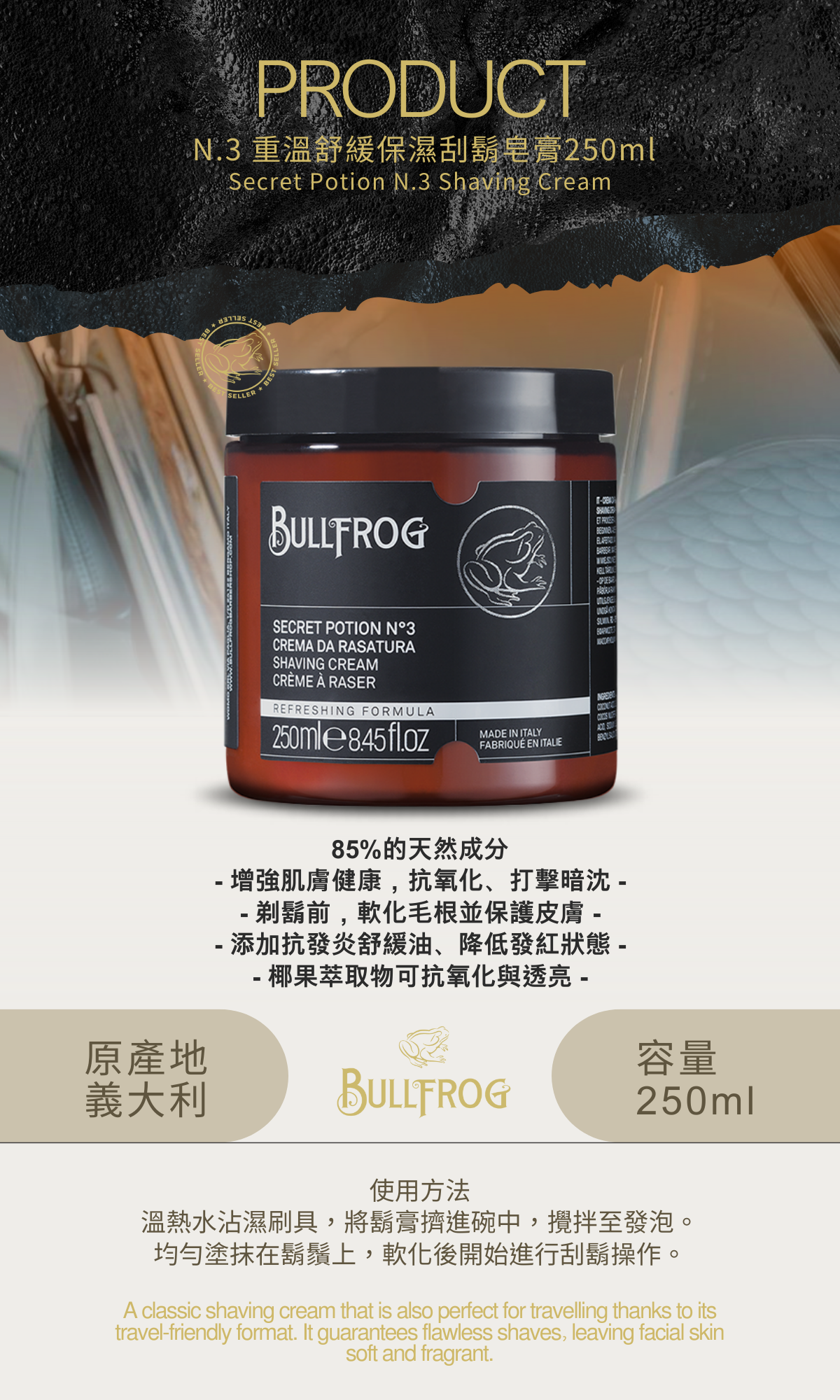 使用方法 : 溫熱水沾濕刷具,將鬍膏擠進碗中,攪拌至發泡。均勻塗抹在鬍鬚上,軟化後開始進行刮鬍操作。
